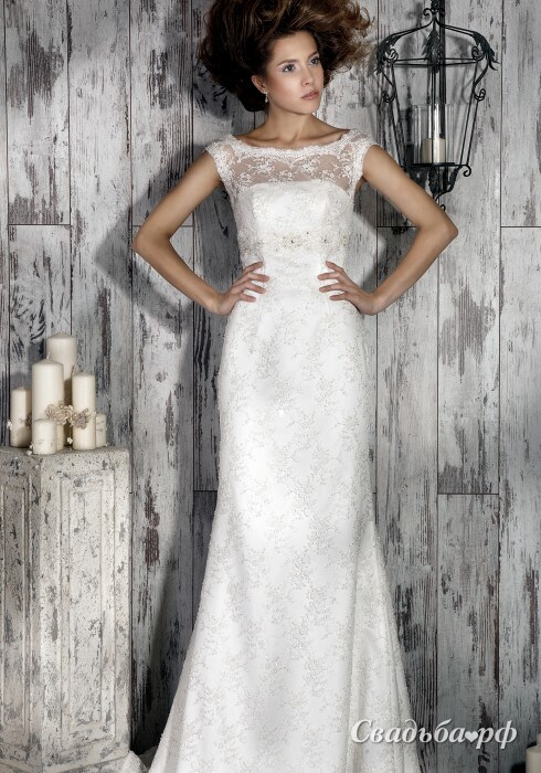 Кружевное закрытое свадебное платье с вырезом лодочка изящно подчеркнет тонкую шею. Грудь подчеркивает оригинальный расшитый поясок. Утонченный, нежный образ наряда никого не оставит равнодушным. Отлично выглядит на молодой невесте среднего или высокого роста, хрупкого телосложения. Добавьте к наряду диадему.