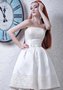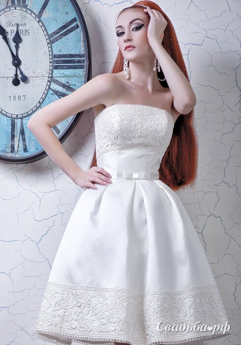 Изысканное свадебное платье отлично подойдёт для создания неповторимого образа в самый торжественный день вашей жизни. Открытая зона декольте в сочетании с богато расшитым верхом корсета привлекают внимание к бюсту. Представленная модель с короткой юбочкой-колокольчиком выгодно подчёркивает талию и прекрасные ножки невесты.