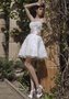 Пышное короткое свадебное платье для смелой невесты. Открытый лиф обтянут искусным кружевом. Линия талии подчеркнута широким атласным поясом, расшитым стразами и бисером. А верхний слой достаточно объёмной юбки выше колена также выполнен из полупрозрачного кружева с рельефным узором. Смелый и одновременно очень нежный наряд.