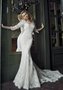 Кружевное свадебное платье силуэта Русалочка создано для самых стильных и притязательных модниц. Изящный корсет с V-образным вырезом на груди украшен ручной вышивкой. Длинные рукава придают наряду особый шик. Эта облегающая модель выгодно подчёркивает все женственные изгибы фигуры. Платье дополнено роскошным шлейфом.