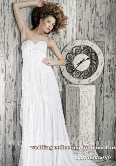 Свадебное платье прямого силуэта представлено известным отечественным дизайнером Ириной Люкс. Миниатюрный корсет с открытой зоной декольте подчёркивает бюст. Завышенная талия украшена поясом и кокетливым бантиком. Струящаяся юбка со шлейфом зрительно вытягивает силуэт. Беспроигрышный вариант для незабываемой свадьбы на морском побережье.