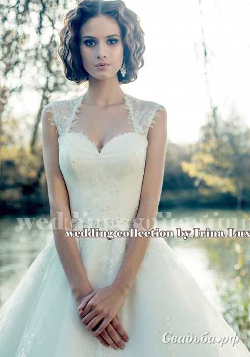 Элегантное платье А-образного силуэта вручную расшито сверкающим бисером и пайетками. Широкие бретели из полупрозрачной ткани переходят на спину. Корсет эффектно подчёркивает талию и акцентирует внимание на бюсте. Пышная юбка обволакивает невесту, словно воздушное облако. В таком наряде от Ирины Люкс Вас точно запомнят!