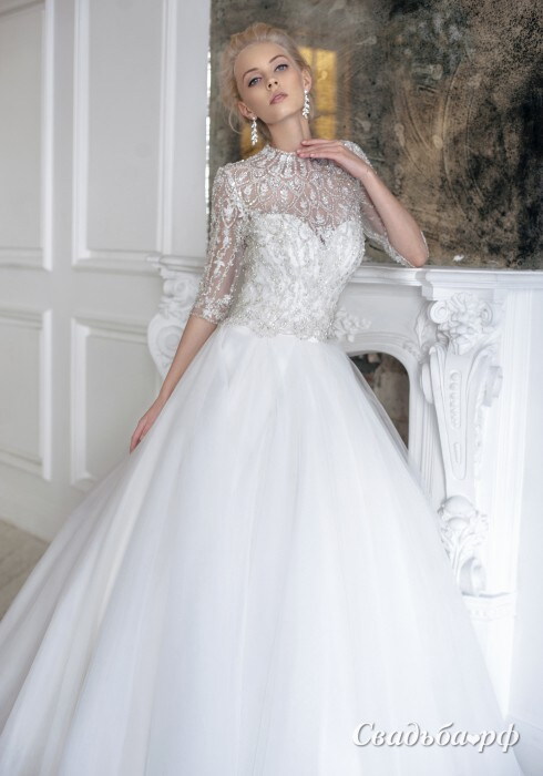 Свадебный наряд из новой коллекции 2015 года никого не оставит равнодушным. Ослепительное итальянское платье с длинными рукавами поможет создать королевский образ. Верх платья выполнен из прозрачного материала, вручную расшитого стразами и бисером. Невесомая фатиновая юбка похожа на нежное и воздушное облако. Вас точно заметят!