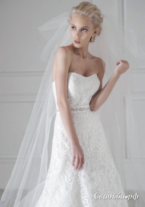 Итальянский наряд из новой коллекции 2015 года никого не оставит равнодушным. Свадебное платье А-образного силуэта поможет создать романтичный образ. Талию подчеркивает искрящийся поясок, вручную расшитый стразами и бисером. Верх платья состоит из жаккардового кружева. Длинная юбка постепенно расширяется к полу и переходит в шлейф.