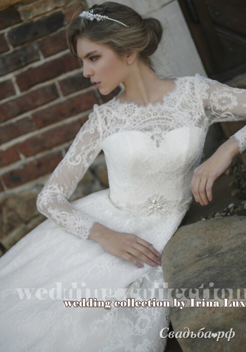 Роскошное свадебное платье с пышной юбкой представлено ведущим российским дизайнеров Ириной Люкс. Закрытый верх из нежного кружева, длинные рукава, спинка на пуговках – всё это помогает создать целомудренный образ прекрасной невесты. Талию подчеркивает изящный поясок со сверкающей вставкой. Нежный и стильный наряд для Вас!