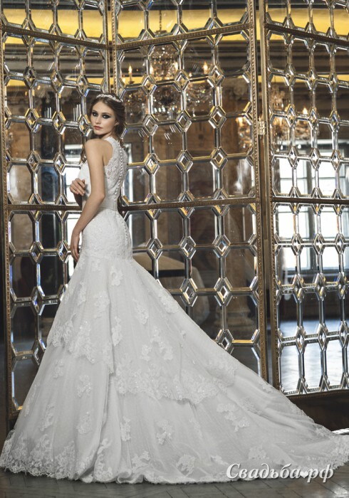 Свадебное платье с удлиненным корсетом и пышной многослойной юбкой из кружева выполнено лучшими дизайнерами Испании. Верх этого изысканного наряда закрыт полупрозрачным кружевом, талию подчеркивает атласный поясок. Длинная юбка от уровня бёдер расширяется и постепенно переходит в шлейф королевских размеров. В таком платье Вы покорите всех!