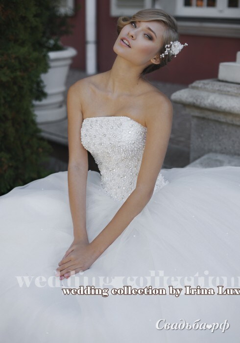 Свадебное платье принцессы с невероятной пышной фатиновой юбкой и шлейфом представлено известным российским дизайнеров Ириной Люкс. Роскошно расшитый корсет с открытой зоной декольте акцентирует внимание на бюсте и выгодно подчёркивает талию. Наряд дополнен кокетливым шлейфом. В этом платье Вы будете неотразимы и запомнитесь всем окружающим!