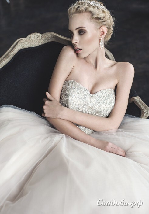 Потрясающей красоты пышное платье силуэта принцесса с роскошным корсетом, полностью расшитым изысканными сверкающими бусинами и бисером. Открытый фигурный лиф модели эффектно подчёркивает женственную красоту и соблазнительность зоны декольте. Роскошная юбка выглядит невесомой и нежно окутывает фигурку невесты, делая образ ещё более утончённым.