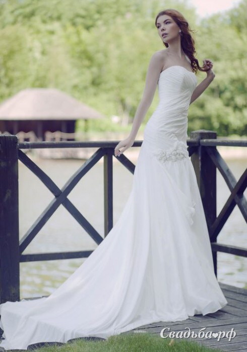 Легкое струящееся платье силуэта русалочка. Удлинённый корсет с соблазнительно открытым лифом задрапирован асимметричными складами мягкой ткани. Линия бёдер эффектно выделена объёмной цветочной композицией, украшенной бисером и бусинами. Расширенная книзу элегантная юбка мягкими волнами ниспадает на пол и превращается в романтичный шлейф.