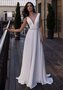 Свадебное платье А-силуэта с V-образным вырезом и открытой спиной на застежке-молнии. Линия талия расшита кристаллами и стразами.