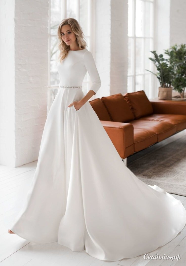 Свадебное платье А-силуэта с рукавом 3/4 и открытой спиной. Линия талии подчеркнута расшитым поясом. В юбке потайные кармашки, что очень удобно.