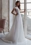 Свадебное платье А-силуэта с вырезом лодочка и открытой спиной на молнии. Плечики декорированы перьями, а спинка нитями из бисера.