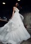 Свадебное платье А-силуэта с каскадными воланами на юбке и лифом на тонких бретелях.