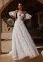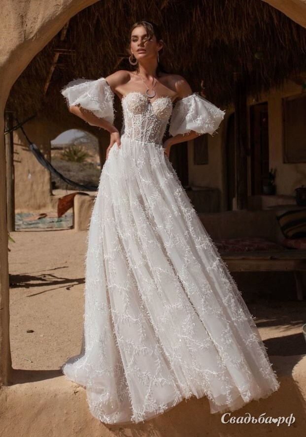 Свадебное платье А-силуэта с корсетом бюстье на корсете. Дополнено съемными объемными рукавами.