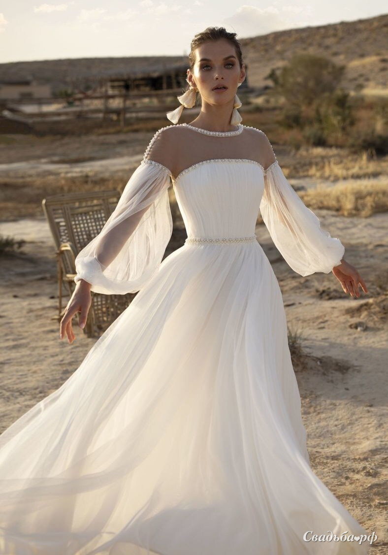 Свадебное платье А-силуэта с длинными рукавами с спинкой на корсете со шнуровкой и пуговичках. Декорировано вышивкой из бусин и жемчуга.