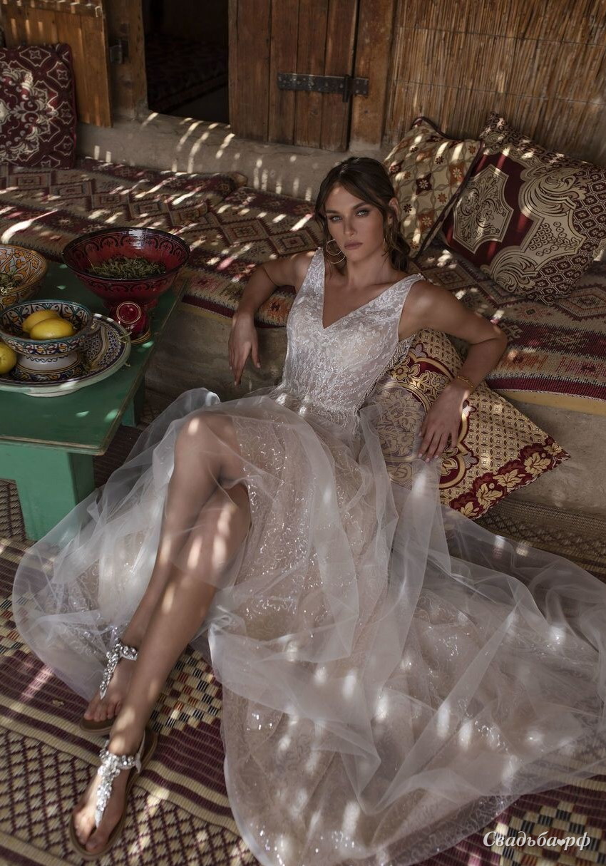 Свадебное платье А-силуэта с V-образным вырезом и спинкой декорированной нитями бахромы.