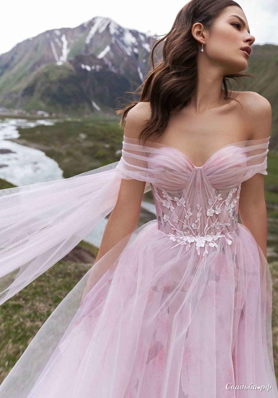 Свадебное платье А-силуэта со спущенными бретелями и вышивкой.