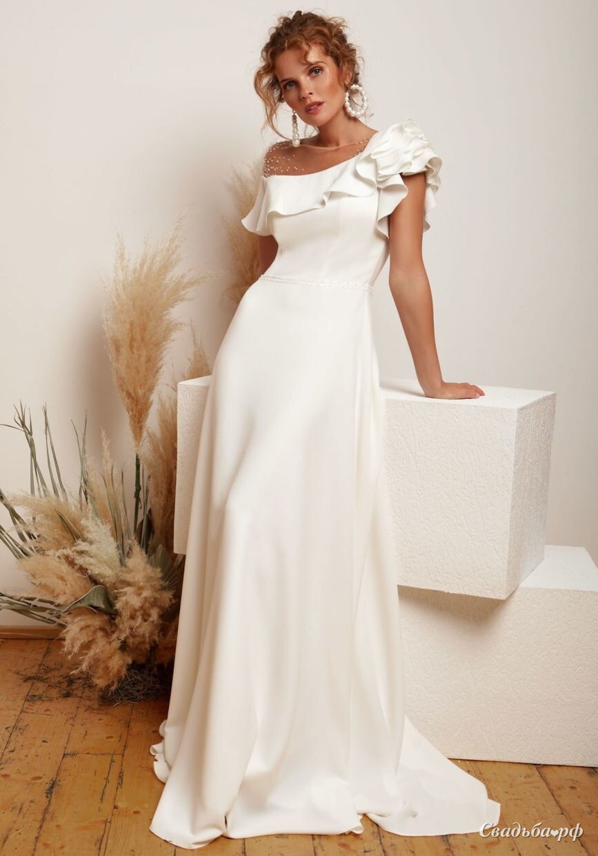 Свадебное платье с воланами и асимметричным верхом. Декорировано жемчужинами.