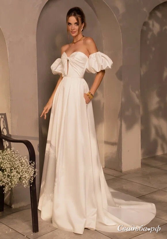 Свадебное платье А-силуэта с открытыми плечами и объемными съемными рукавами. Спинка на молнии.