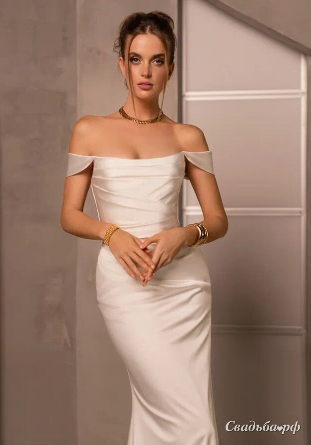 Свадебное платье облегающего силуэта с открытыми плечами и спущенными бретелями. Спинка на молнии. Основной материал: тонкий атлас
