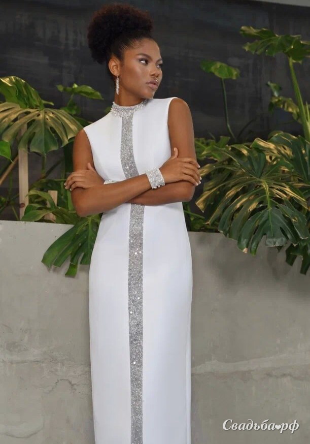 Свадебное платье прямого силуэта без рукавов и со спинкой на молнии. Манжеты продаются отдельно. Основной материал: тонкий атлас, глиттер