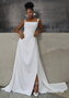 Атласное свадебное платье А-силуэта с квадратным вырезом, на бретелях и разрезом в юбке. Спинка открытая на молнии. Перчатки продаются отдельно.