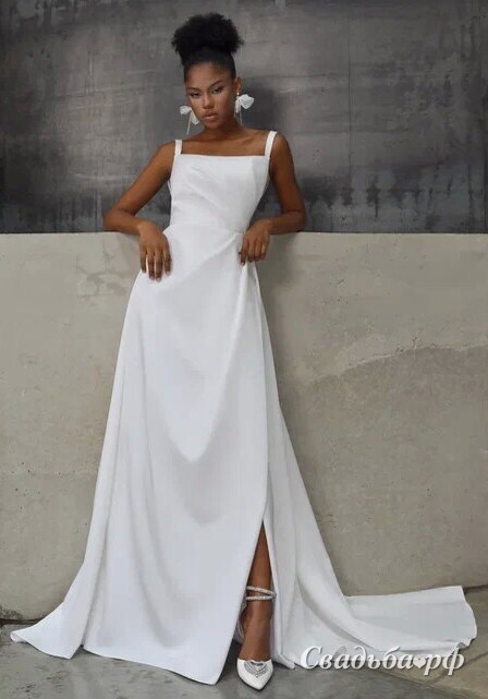 Атласное свадебное платье А-силуэта с квадратным вырезом, на бретелях и разрезом в юбке. Спинка открытая на молнии. Перчатки продаются отдельно.