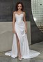 Свадебное платье А-силуэта на тонких бретелях. Юбка со шлейфом красиво задрапирована, эффектный разрез вдоль ноги - изюминка платья. Бретели и линия талии декорированы вышивкой бисера. Спинка на молнии. Основной материал - атлас.