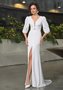 Свадебное платье облегающего силуэта с объемными рукавами чуть ниже локтя и высоким разрезом спереди. Основной материал: тонкий атлас