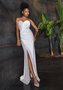Атласное свадебное платье облегающего силуэта с вырезом сердечком и разрезом чуть выше колена. Правая часть платья расшита пайетками, левая - атласная с красивой драпировкой.