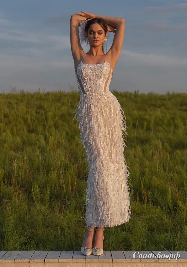 Свадебное платье облегающего силуэта длины миди с разрезом сзади, декорировано перьями и бисером.