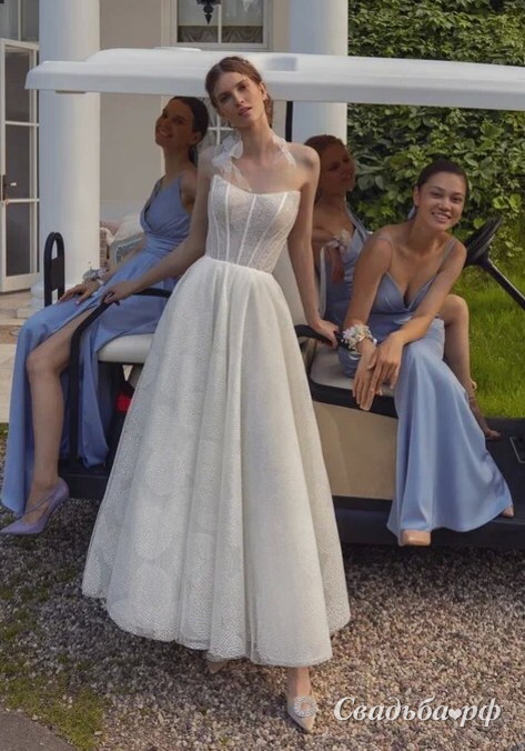 Фатиновое свадебное платье с многослойной пышной юбкой длины миди, с открытым верхом и спинкой на молнии.