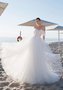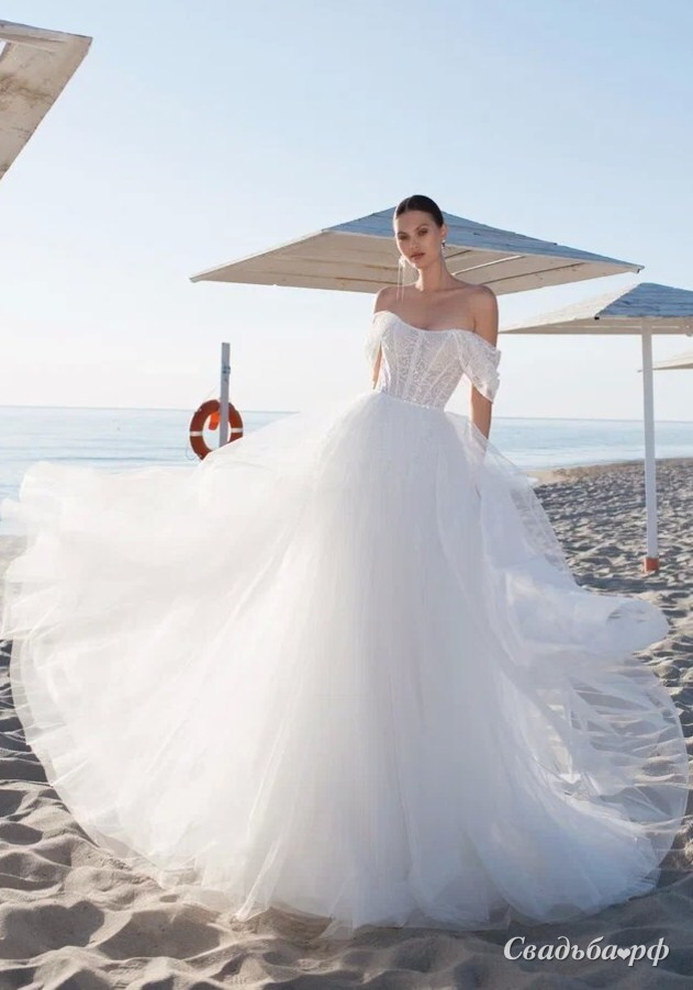 Свадебное платье А-силуэта со спущенными бретелями и спинкой на молнии. Основной материал: фатин, кружево, пайетки