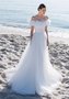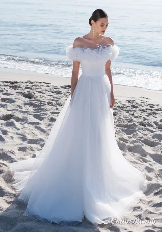 Свадебное платье А-силуэта из органзы с открытой линией плеч, декорированной перьями, и спинкой на молнии.