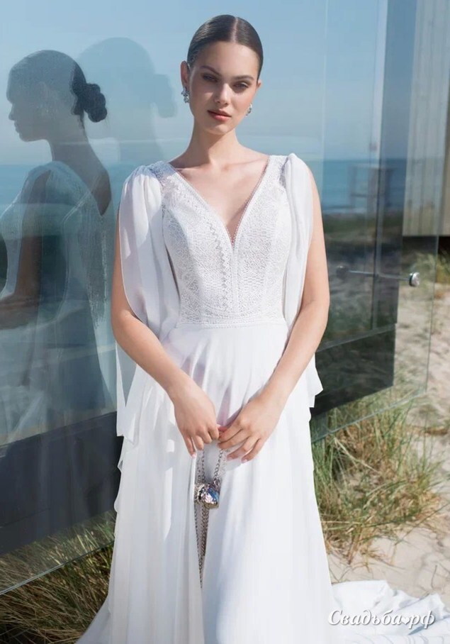 Свадебное платье А-силуэта с небольшим V-образным вырезом, рукавчиками-крылышками и частично открытой спиной, декорированной бахромой. Основной материал: шифон, кружево