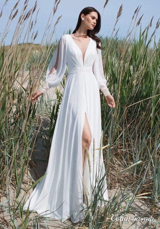 Свадебное платье А-силуэта с объемными длинными рукавами, V-образным вырезом и высоким разрезом. Основной материал: шифон