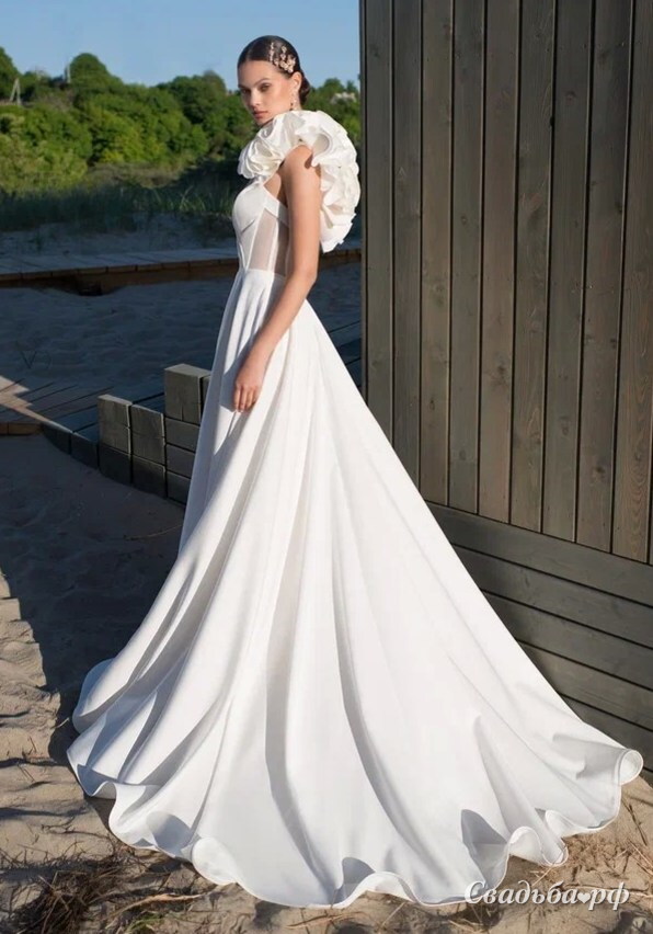 Свадебное платье А-силуэта с открытым верхом и спинкой на молнии. Основной материал: атлас