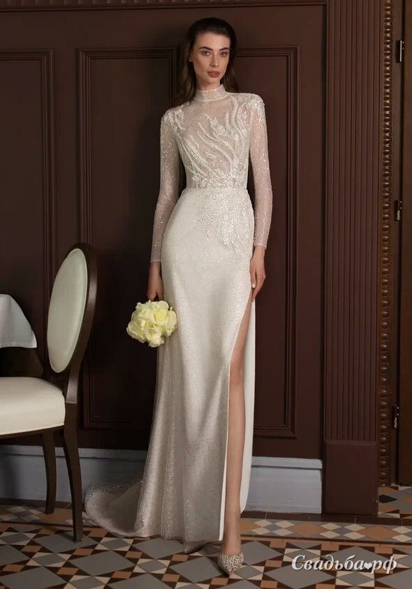 Свадебное платье облегающего силуэта с длинными рукавами и воротничком-стоечкой. Юбка с небольшим шлейфом и высоким разрезом сбоку. Основной материал: глиттер, кружево