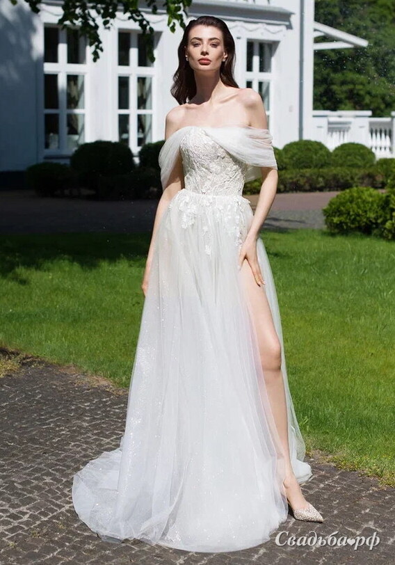 Свадебное платье А-силуэта с асимметричными спущенными бретелями и спинкой на молнии. Основной материал: фатин, глиттер, кружево