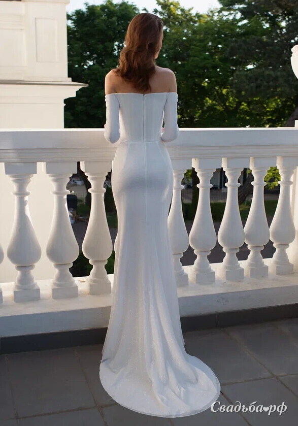 Свадебное платье облегающего силуэта с открытыми плечами и длинными рукавами. Спинка на молнии. Основной материал: глиттер