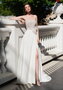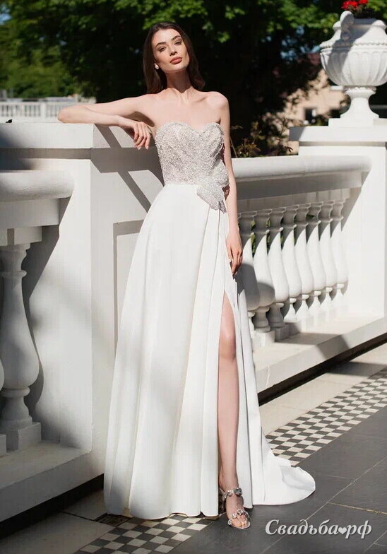 Свадебное платье А-силуэта с открытым верхом. Юбка с небольшим шлейфом сделана на запАх, слегка приоткрывает ножку при ходьбе. Лиф декорирован пайетками и эффектным бантом на талии. Основной материал: креп, пайетки
