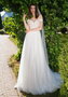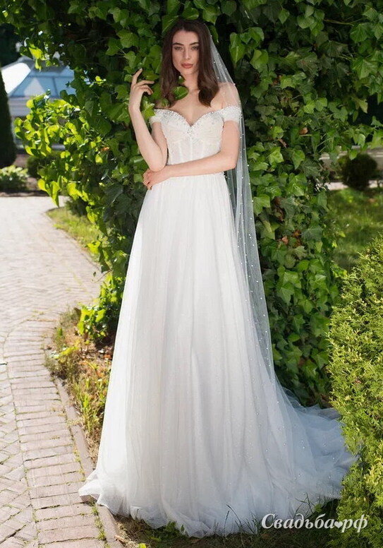 Свадебное платье А-силуэта со спущенными бретелями и спинкой на молнии. Декорировано жемчужинами. Основной материал: фатин, глиттер, жемчужины