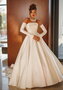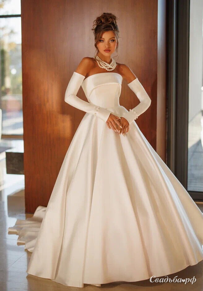 Свадебное платье бального силуэта с открытыми плечиками и длинными рукавами. Основной материал: атлас