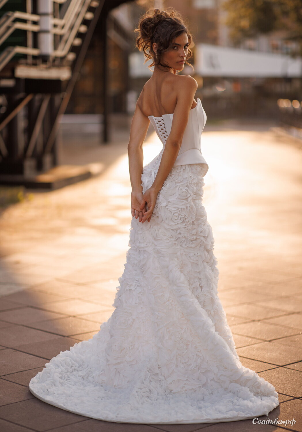 Свадебное платье приталенного кроя, силуэта русалка, состоит из корсета и юбки с шифоновыми 3D-цветами. Материал: микадо, шифон