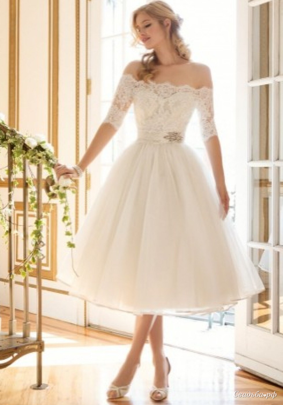Легкое короткое (длина "миди") свадебное платье.