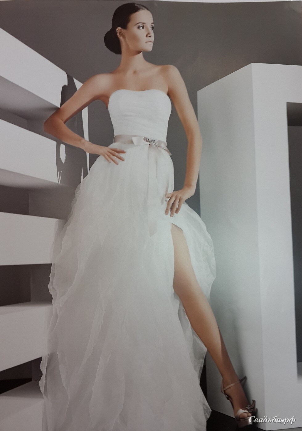Легкое открытое свадебное платье. С драпированным лифом и вертикальными рядами оборок. Шарм и соблазнительность добавляет изящный вырез до середины бедра. Это платье Вы можете приобрести в салоне Sanrina (1 этаж, павильон И-5). www.dressforyou.ru