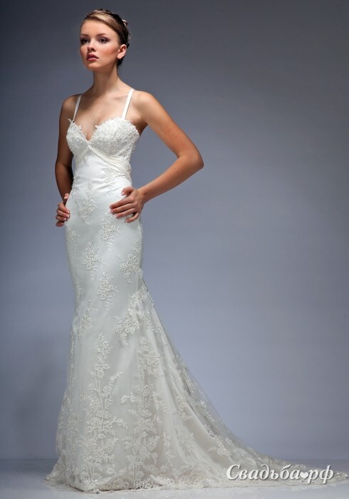 Восхитительное платье с соблазнительной зоной декольте и тонкими бретелями никого не оставит равнодушным. Этот облегающий свадебный наряд эффектно подчёркивает все женственные изгибы фигуры и привлекает внимание к бюсту. Модель целиком расшита кристаллами и бисером. Длинный шлейф придаёт образу особый шарм.