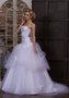 Поистине королевское свадебное платье с заниженным корсетом придётся по вкусу самым стильным невестам. Открытая зона декольте привлекает внимание. Широкий поясок с объёмными цветами ручной работы выгодно подчёркивает талию. Пышная юбка с крупными сборками драпировки из невесомой ткани дополнена шлейфом.