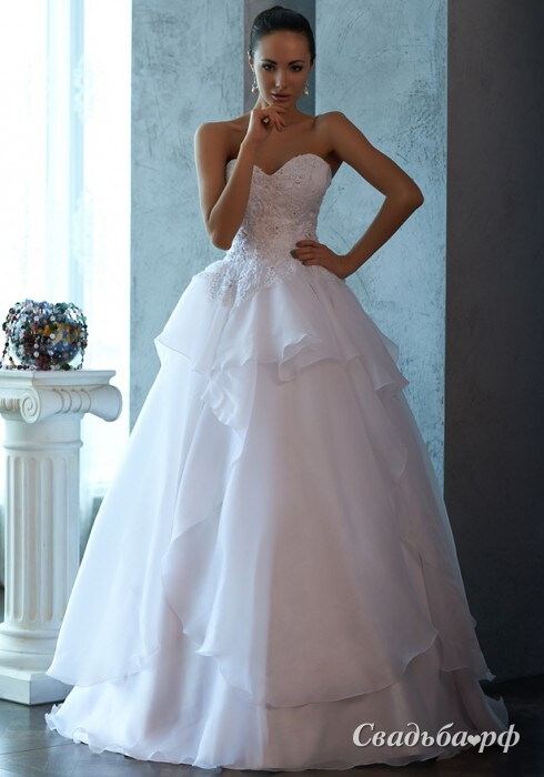 Свадебное платье Вивиан поможет создать нежный и чистый образ современной невесты. Элегантный корсет с соблазнительной зоной декольте вручную расшит бисером. Наряд выгодно подчёркивает талию и привлекает внимание к бюсту. Пышная юбка с многоярусными воланами из лёгкой ткани придаёт модели особый шарм.