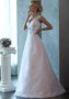 Свадебное платье Лоренса выполнено из кружева. Соблазнительная зона декольте обрамлена широкими бретелями. Изящная лента под грудью дополнена миниатюрным цветком с лепестками - настоящими жемчужинами. Длинная юбка постепенно расширяется к полу и переходит в шлейф. Модель выгодно подчёркивает все женственные изгибы фигуры.